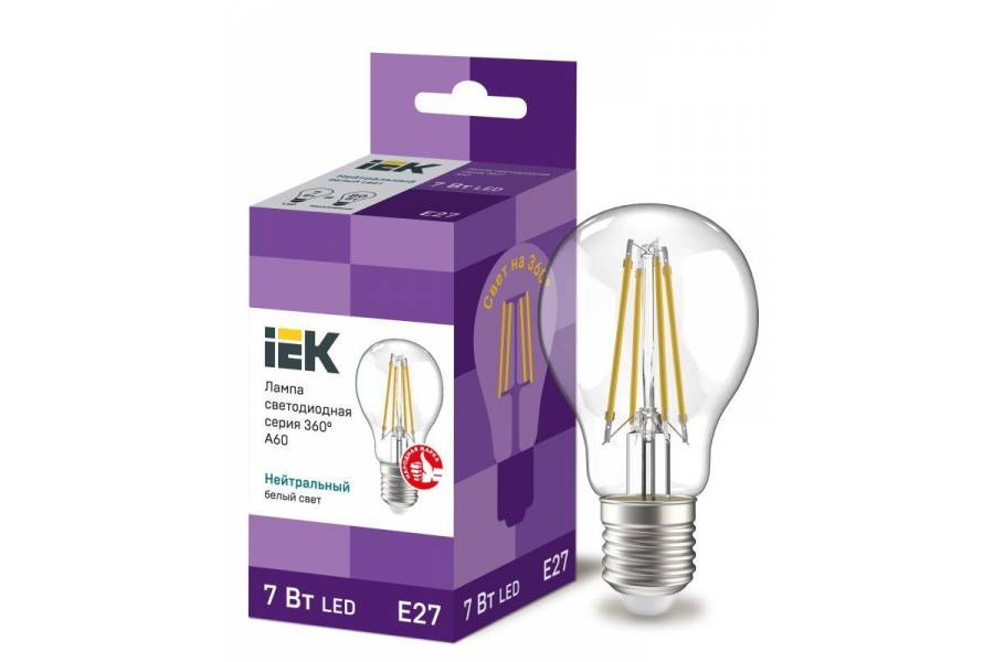 Лампа светодиодная филаментная 360° 7Вт A60 шар 4000К E27 230В прозр. IEK LLF-A60-7-230-40-E27-CL