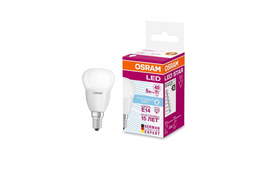 Лампа светодиодная LED STAR CLASSIC P 40 5W/840 5Вт шар 4000К нейтр. бел. E14 470лм 220-240В матов. пласт. OSRAM 4058075056923